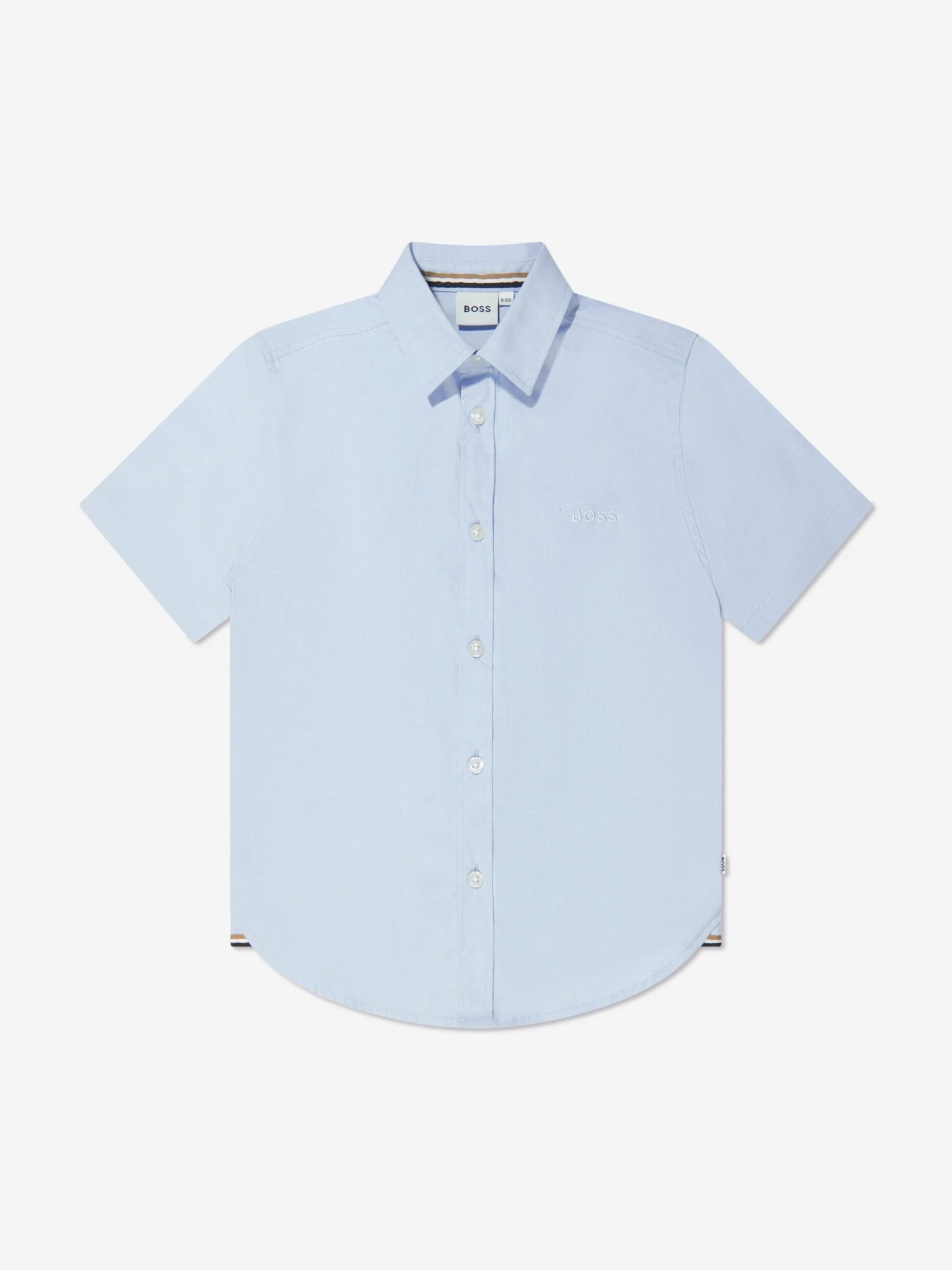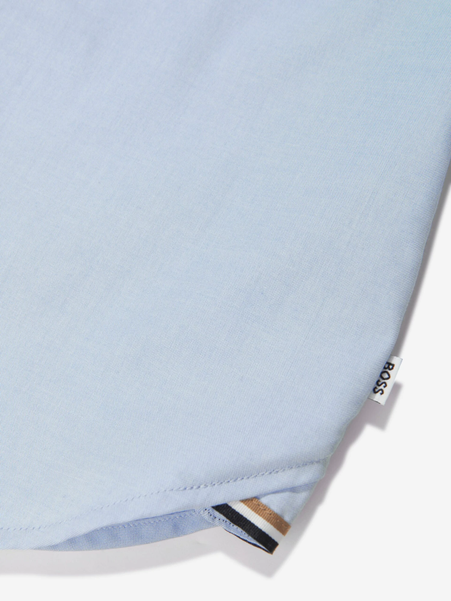 Introducing the Boss Boys Short Sleeve Logo Shirt in Blue – an exemplification of luxury and style for your boy’s Wedding looks. Key attributes include:
