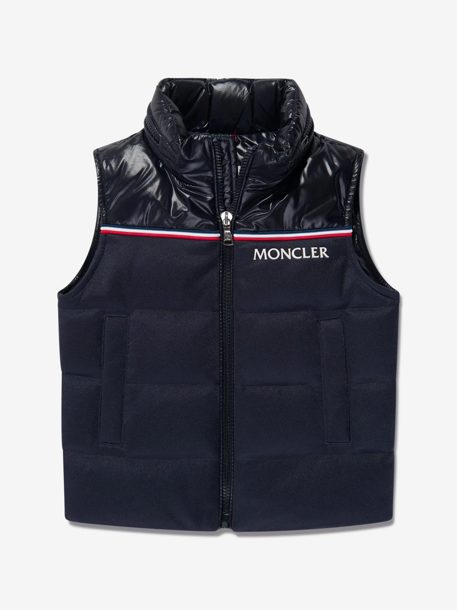 A luxe layering option, this navy blue Peter gilet from Moncler offers protection from the elements in a lightweight and stylish shell. Crafted from an eco-conscious recycled polyester, the vest is down-filled for lush warmth and comfort. Featuring a pull-out hood, the geometric quilted design is finished with a tricolour yoke across the front, and logo on the chest to finish.