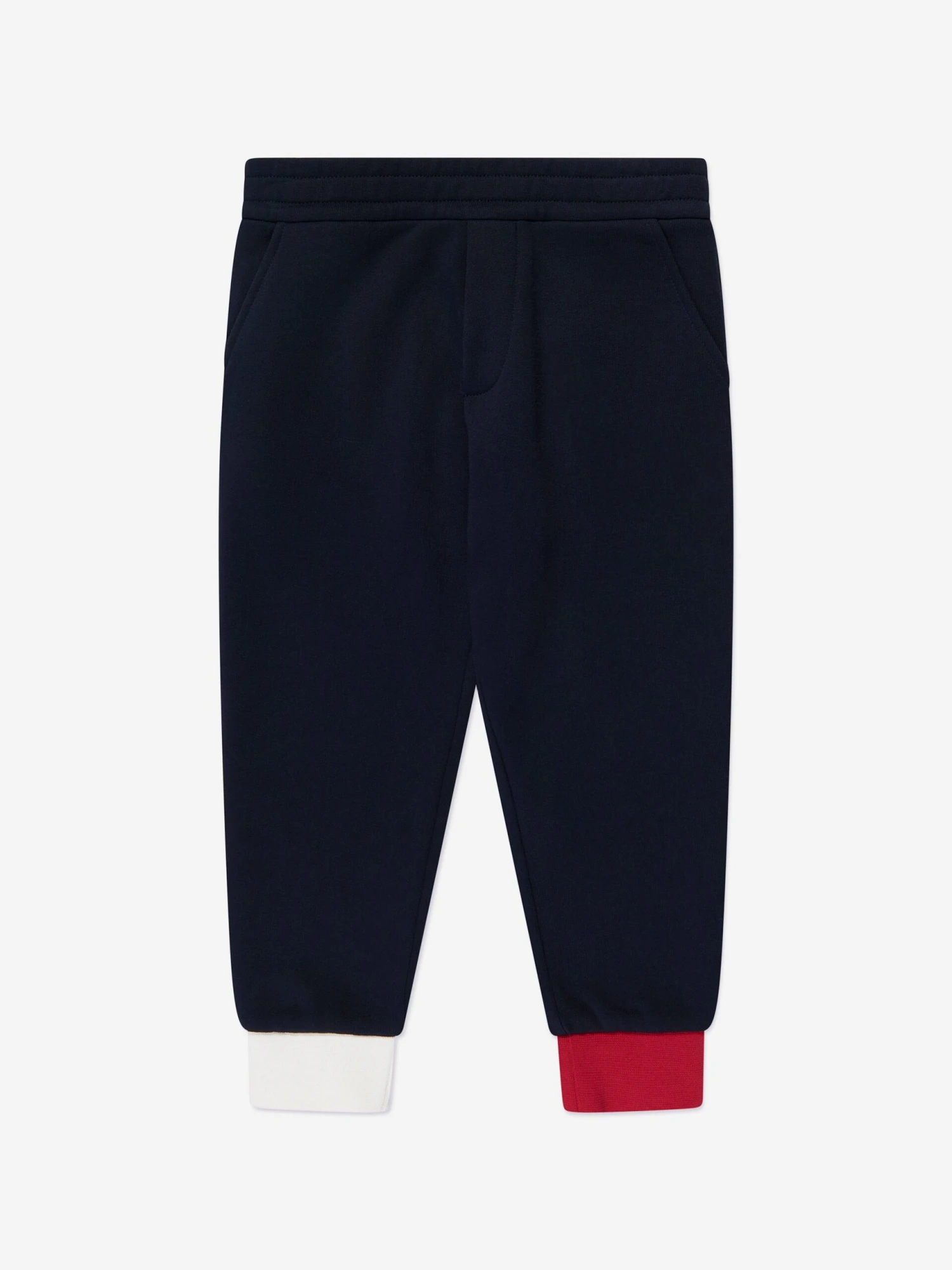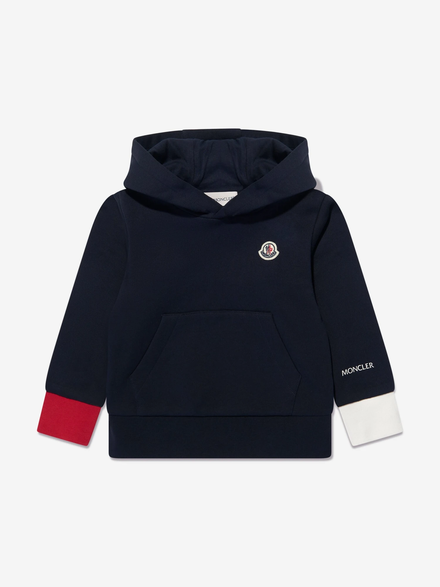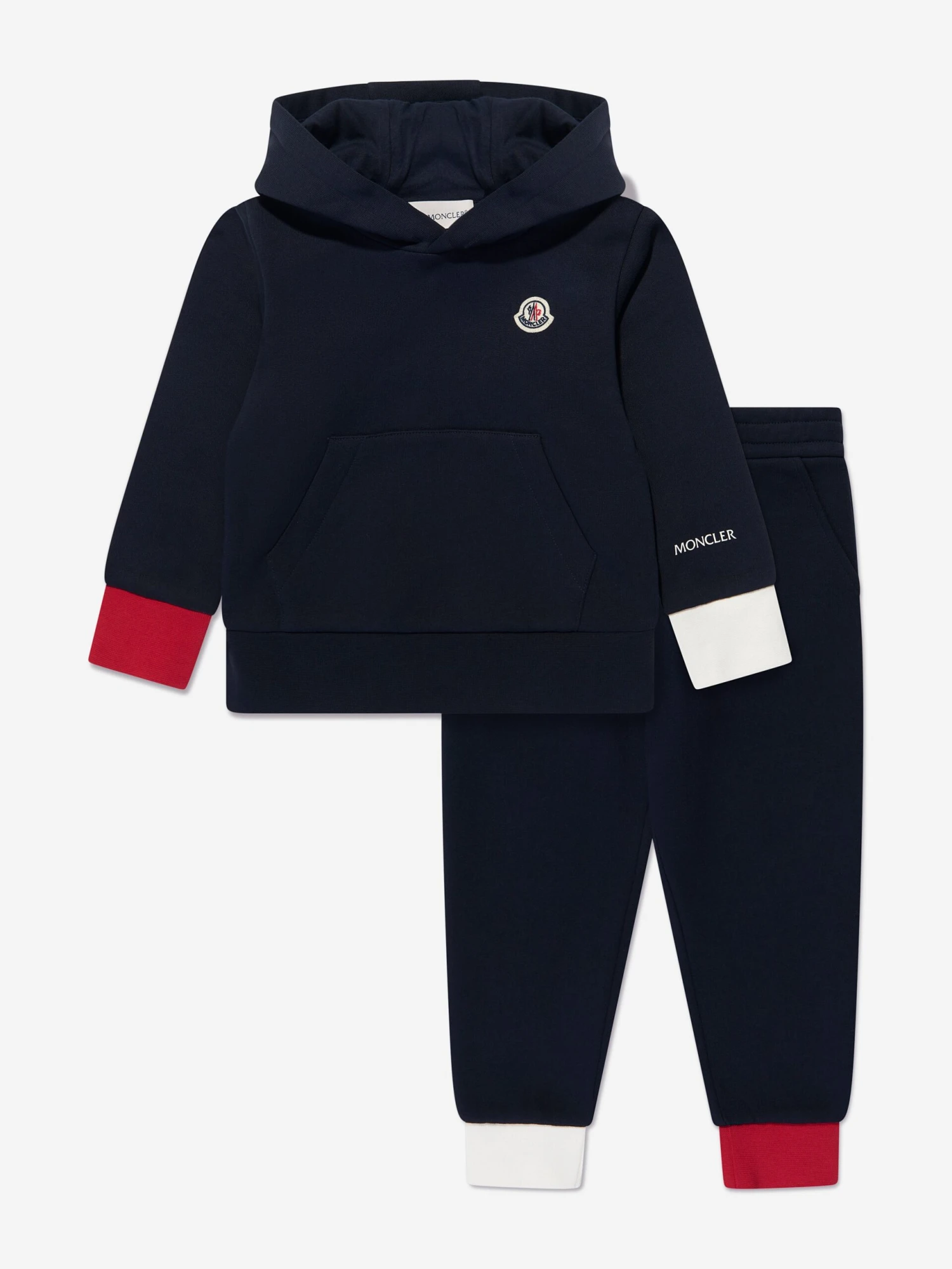Alpine tradition and energy is manifested through this kids navy blue tracksuit from Moncler. Crafted from a soft and comfy cotton fleece, the minimally elegant design is enhanced with contrast red and white cuffs. The iconic monogram motif adorns the chest for a look made for everyday wear, whatever the season.