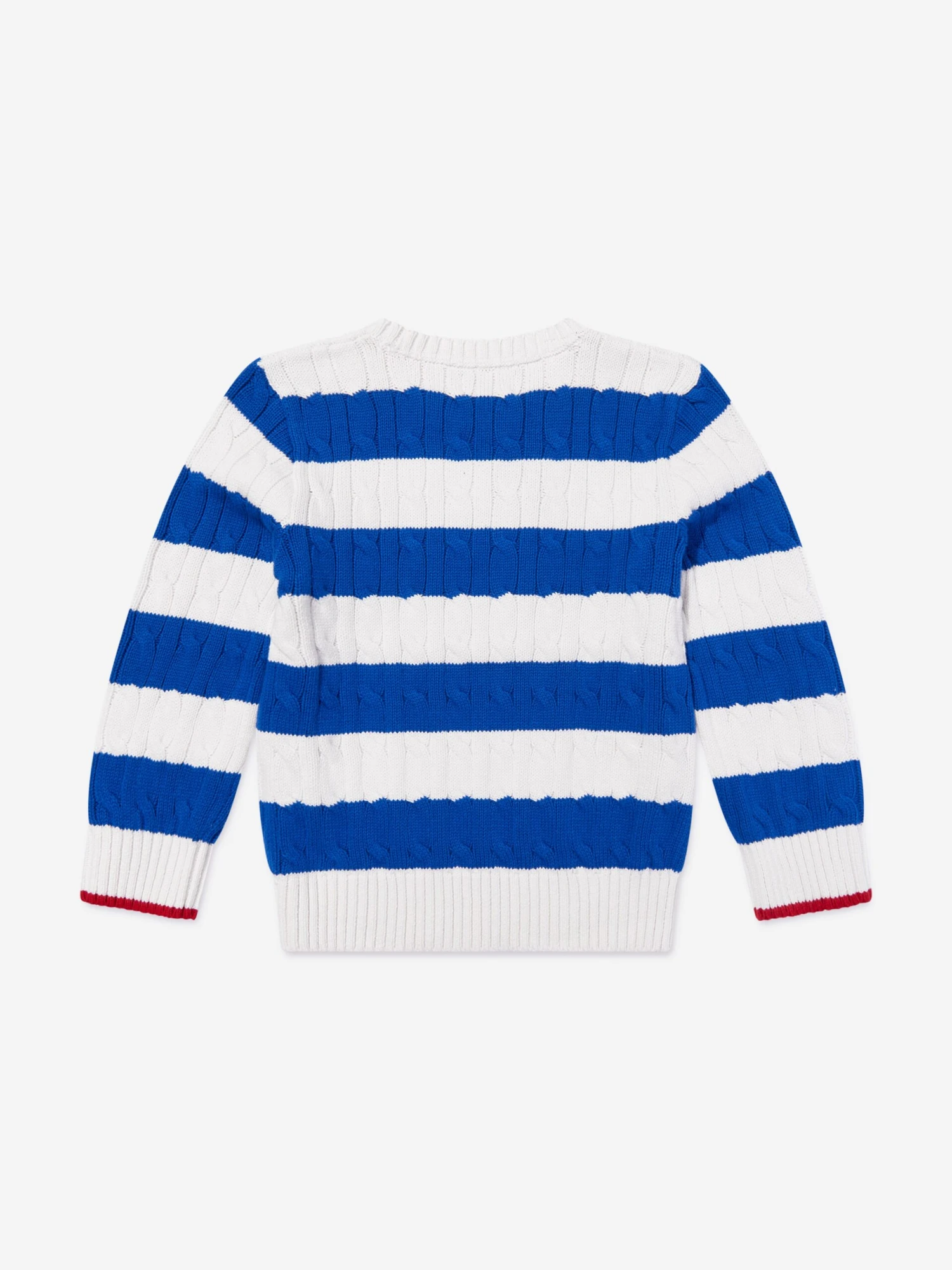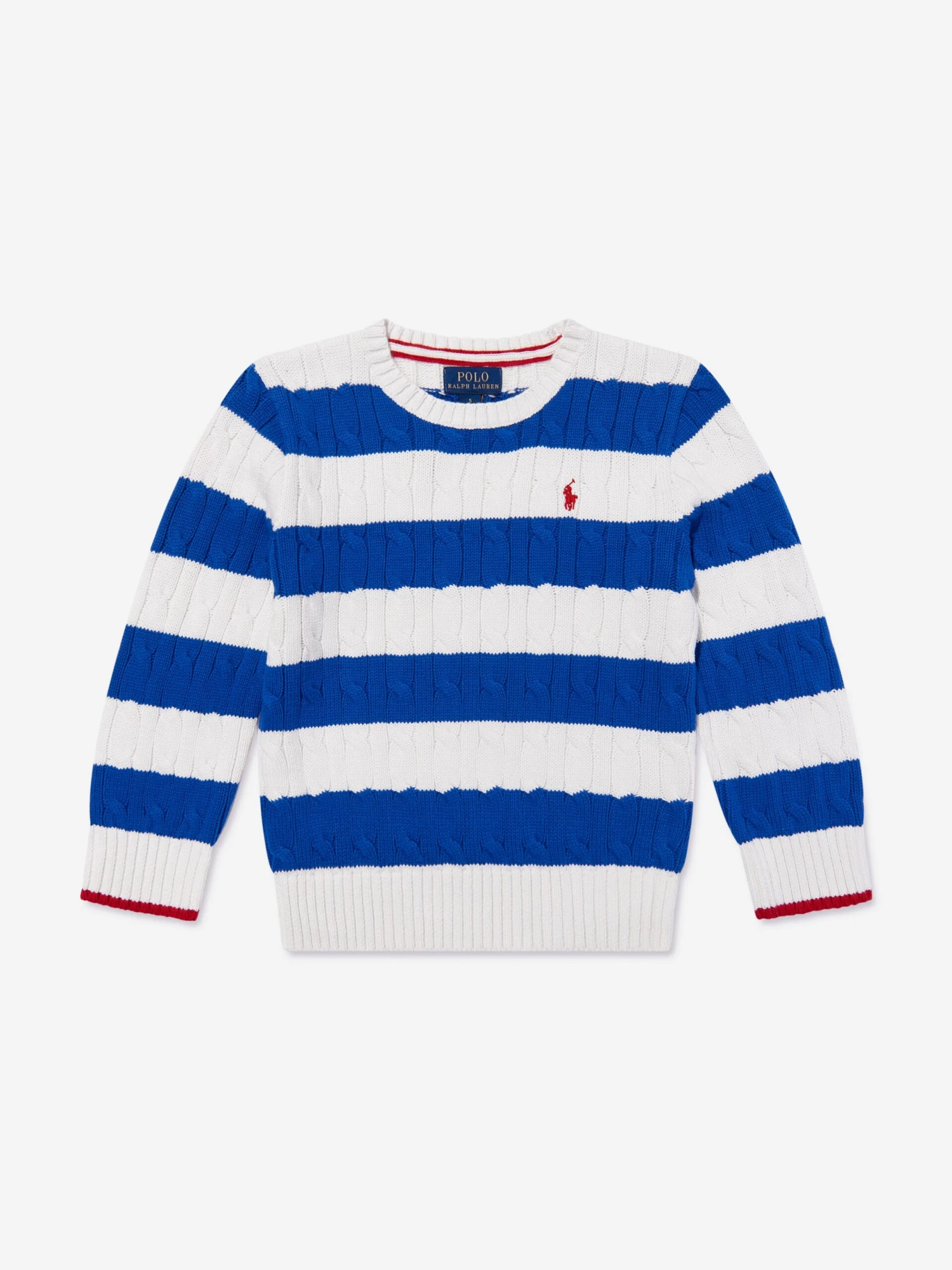 Introducing Ralph Lauren’s Boys Striped Cable Knit Jumper in blue, a luxury staple every young gentleman’s closet needs for SS2024. Check out the outstanding features that make this jumper special: