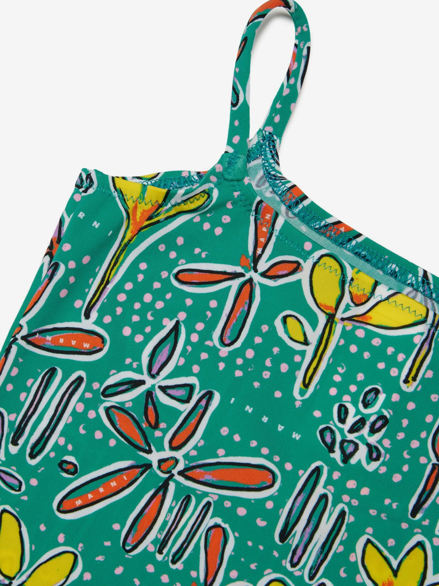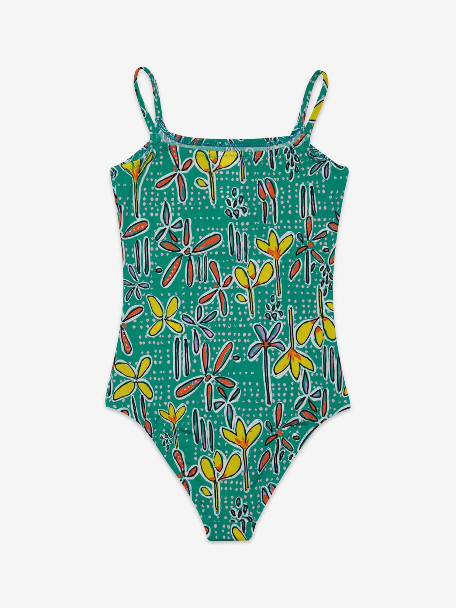 Marni’s exploration of colour and aesthetic possibilities are amplified in this girls green swimsuit. It showcases allover Carioca print with sleek shoulder straps. Both stylish and sophisticated, it will be her favourite piece this summer.
