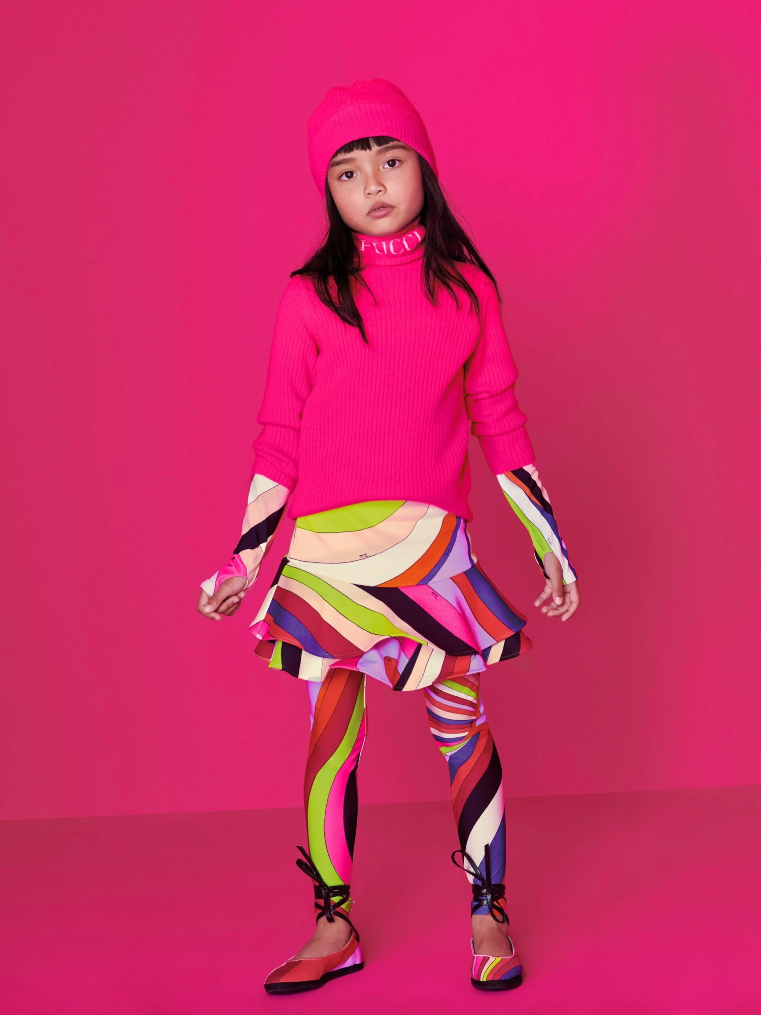 This girls pink kitted roll-neck jumper dials up Pucci’s love of colour to the max with a vibrant neon hue. Crafted from a soft, lush wool-cashmere blend, the youthful piece features a contrast white intarsia logo around the neck. Pair with a long black skirt for a sleek and versatile look.
