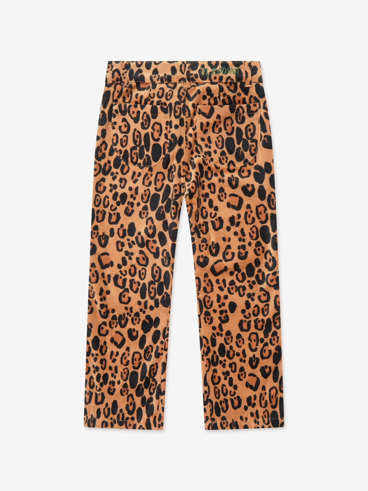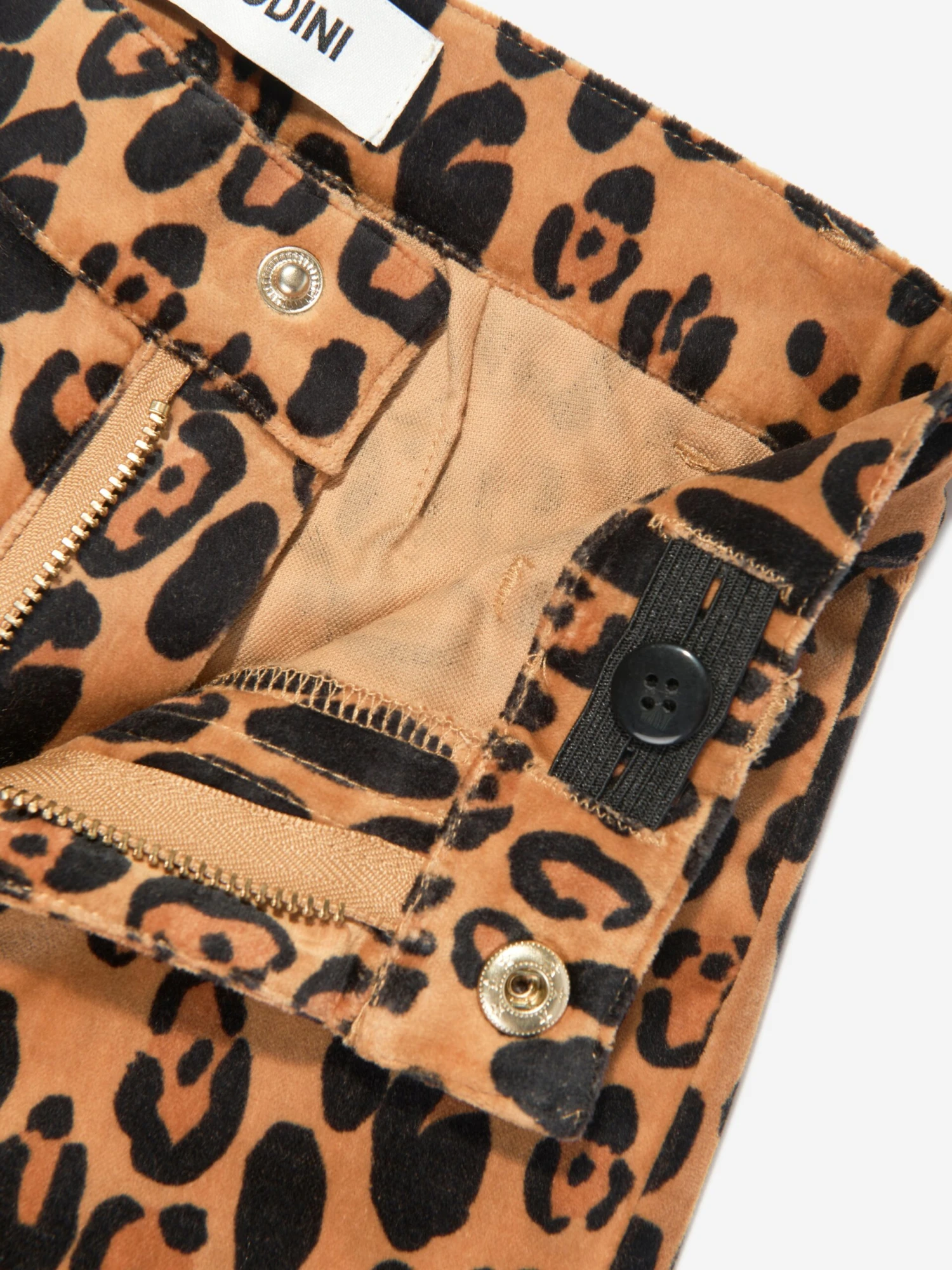 Introducing Mini Rodini’s Girls Leopard Velvet Flared Trousers in Brown; an exquisite addition to your girl’s fashion arsenal.