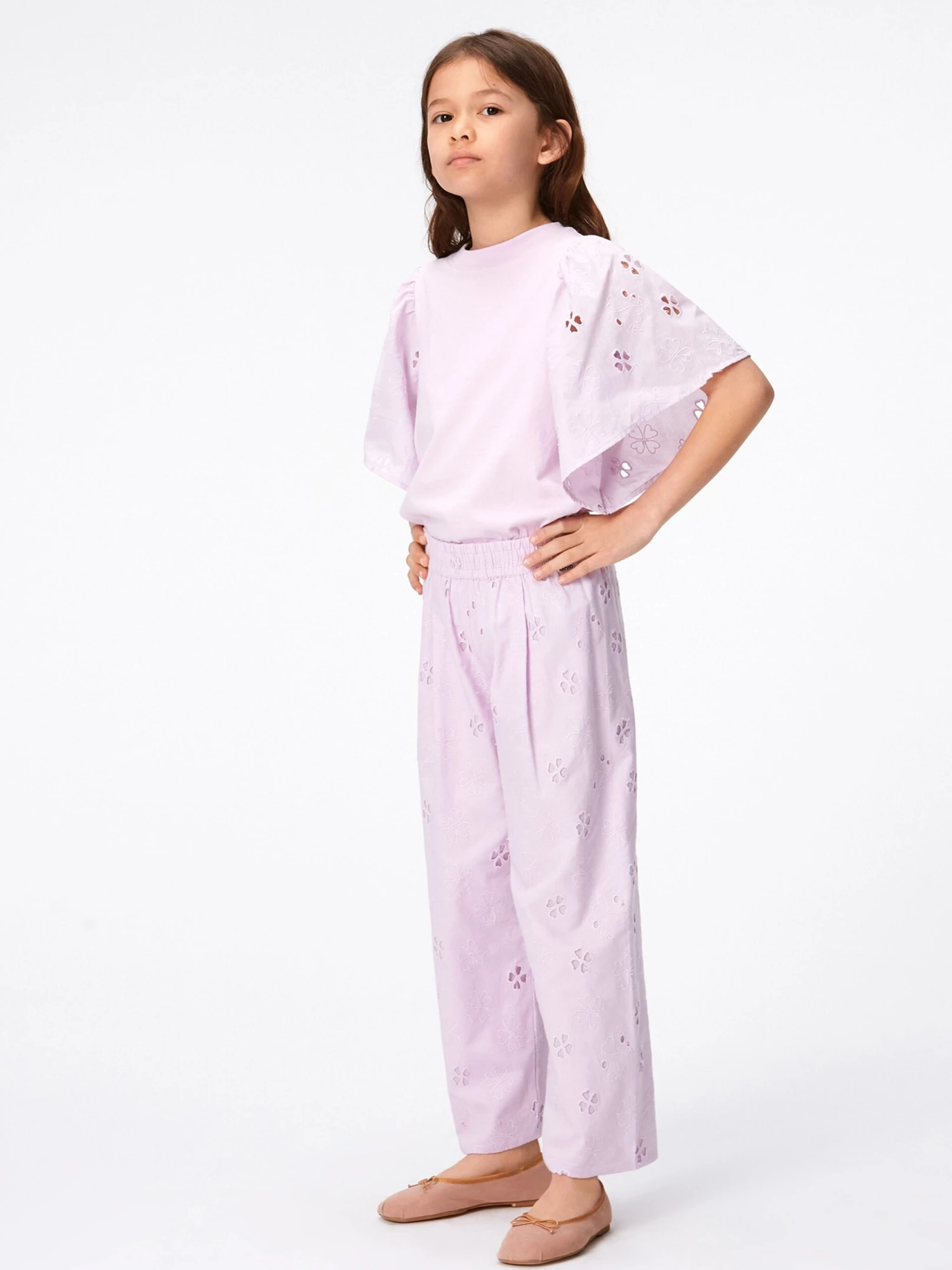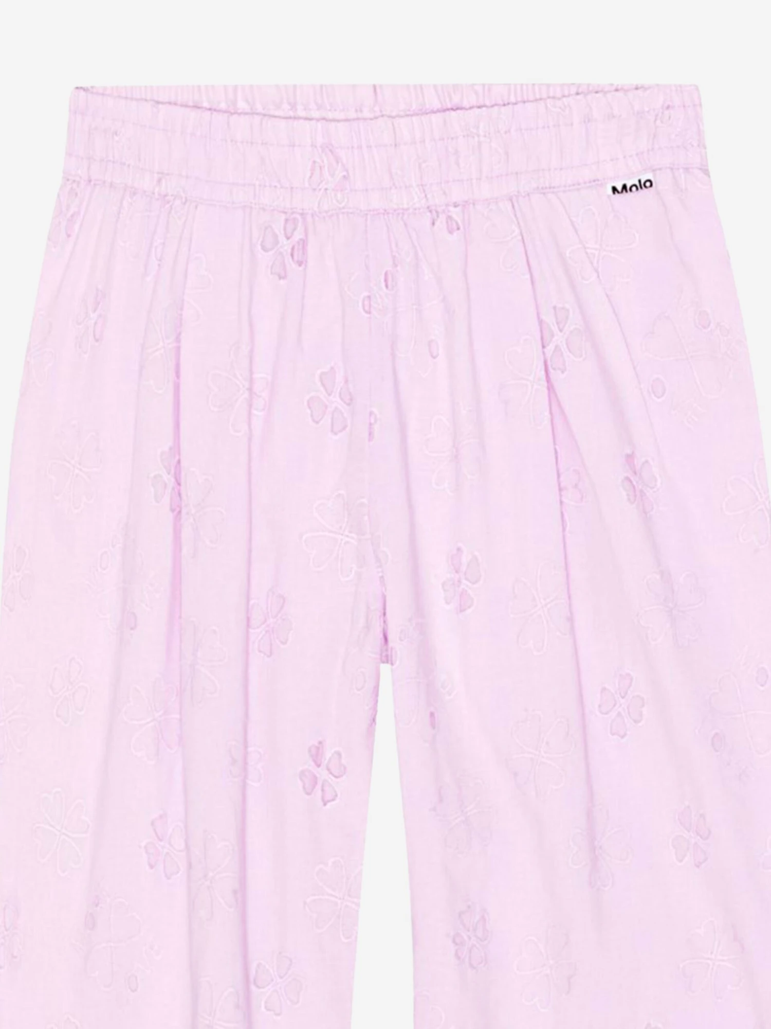 Molo project fun and creative energy into their flawless constructions. These girls floral print alpine glow trousers are in a broderie anglaise quality both French inspired and divine. They come in organic cotton with an elastic waist and a pleat in the front to emphasise the design on a greater level.